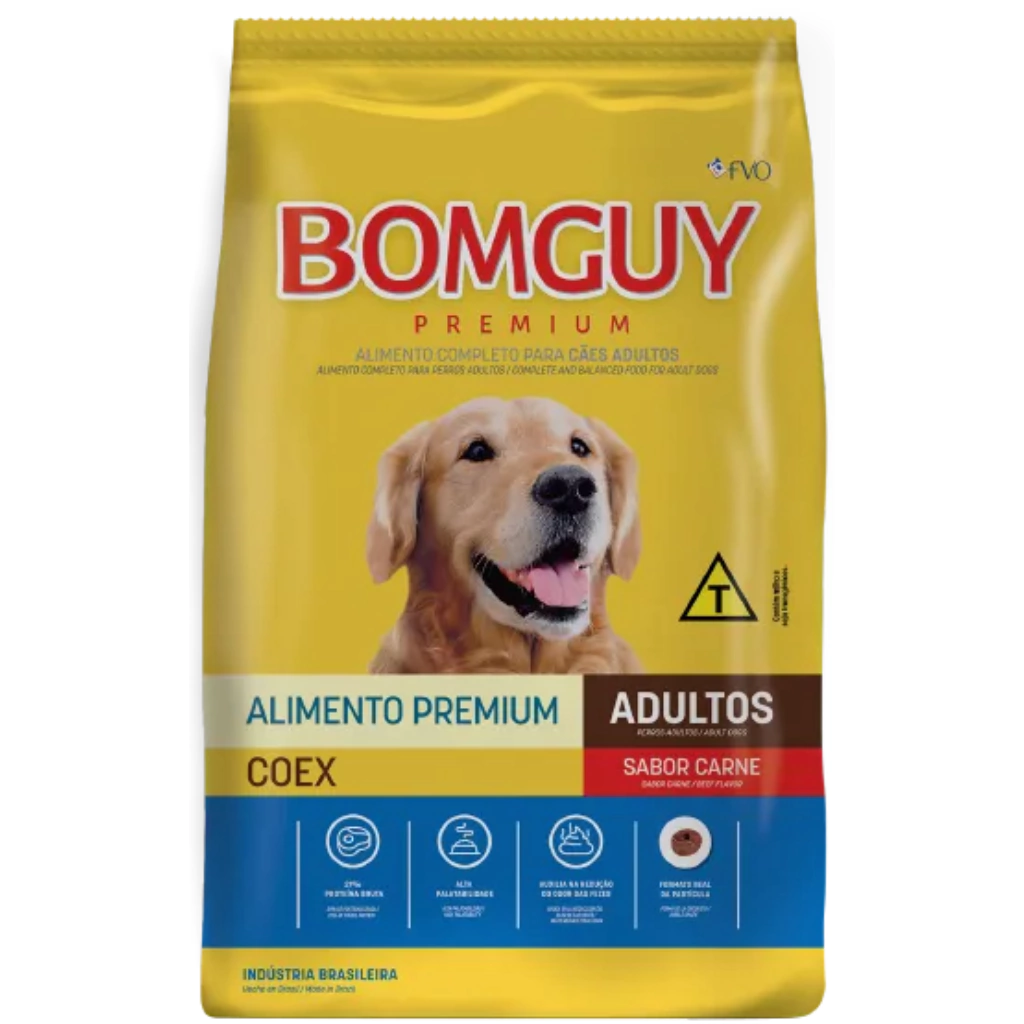 Bomguy Carne Coex é uma ração completa para cães adultos, desenvolvida para unir alta aceitação de sabor com valor nutricional equilibrado. A fórmula possui cerca de 21% de proteína bruta, o que oferece suporte para manutenção dos músculos e energia adequada no dia a dia. A tecnologia Coex de extrusão dupla favorece melhor digestibilidade e paladar mais atraente para os cães. O extrato de yucca presente na composição auxilia na diminuição de odores copro‑intestinais, contribuindo para bad odor reduzido das fezes. Ingredientes selecionados combinam nutrientes que agregam saúde para pele, pelagem, ossos e dentes, além de promover fezes mais firmes. É recomendada para cães adultos de todos os portes, trazendo praticidade para tutores que buscam uma ração de uso geral. Apesar de não existir confirmação de site oficial amplo, as especificações são consistentes entre revendedores confiáveis.