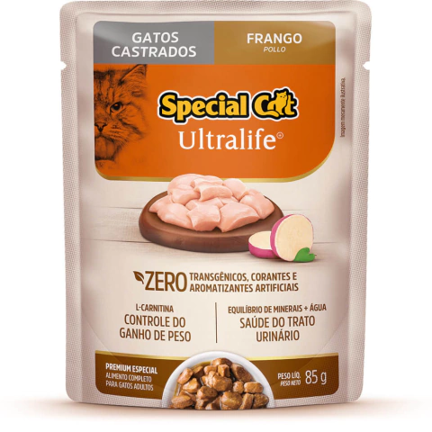 Sachê Special Cat Ultralife Adultos Gatos Castrados sabor frango oferece nutrição completa para felinos após a castração, com ênfase em controle de peso e saúde urinária. A fórmula foi elaborada por veterinários e dispensa corantes e aromatizantes artificiais. L‑carnitina está presente para ajudar na metabolização de gorduras, favorecendo o físico ideal. O equilíbrio correto de minerais, aliado a elevado teor de água, sustenta a função adequada do trato urinário. Pertence à linha Premium Especial, garantindo qualidade superior e atenção aos detalhes. Textura úmida e sabor frango tornam o alimento palatável, estimulando o apetite de gatos com preferência exigente. Indicado para uso contínuo como parte da dieta diária de gatos adultos castrados.