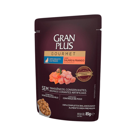 O Sachê Gran Plus Gourmet Salmão e Frango para Gato Castrado é uma ração úmida completa e balanceada, indicada para gatos adultos castrados. Com sabor irresistível de salmão e frango, oferece pedaços suculentos que agradam até os felinos mais exigentes. Sua fórmula contém L-carnitina, que auxilia no controle de peso, e ômega 6, zinco e vitamina A, que contribuem para a saúde da pele e do pelo. Além disso, é livre de conservantes, aromas e corantes artificiais, garantindo uma alimentação saudável e saborosa para o seu gato.