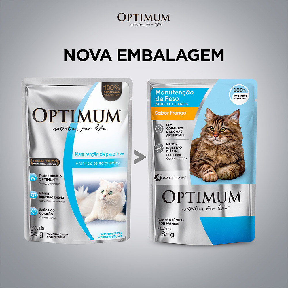 A ração úmida Optimum é completa pois possui todos os nutrientes que o pet precisa. Funcional pois garante parte do consumo de água diário, essencial para a saúde do animal. O que o gato consome em cada etapa de vida tem resultado direto em seu crescimento, força e bem-estar. Por isso Optimum sachê foi desenvolvido usando as melhores matérias-primas, proteínas cuidadosamente selecionadas e nutrientes essenciais.